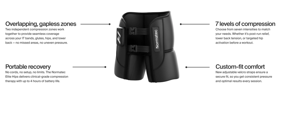 Say hello to the first-ever fully portable dynamic air compression device for the hips. The Normatec Premier Hips brings powerful recovery to your hips, IT bands, and lower back —anytime, anywhere. With gapless compression coverage, a tailored fit, and a sleek, cordless design, this is next-level hip care for athletes, movers, and anyone looking to move better.
